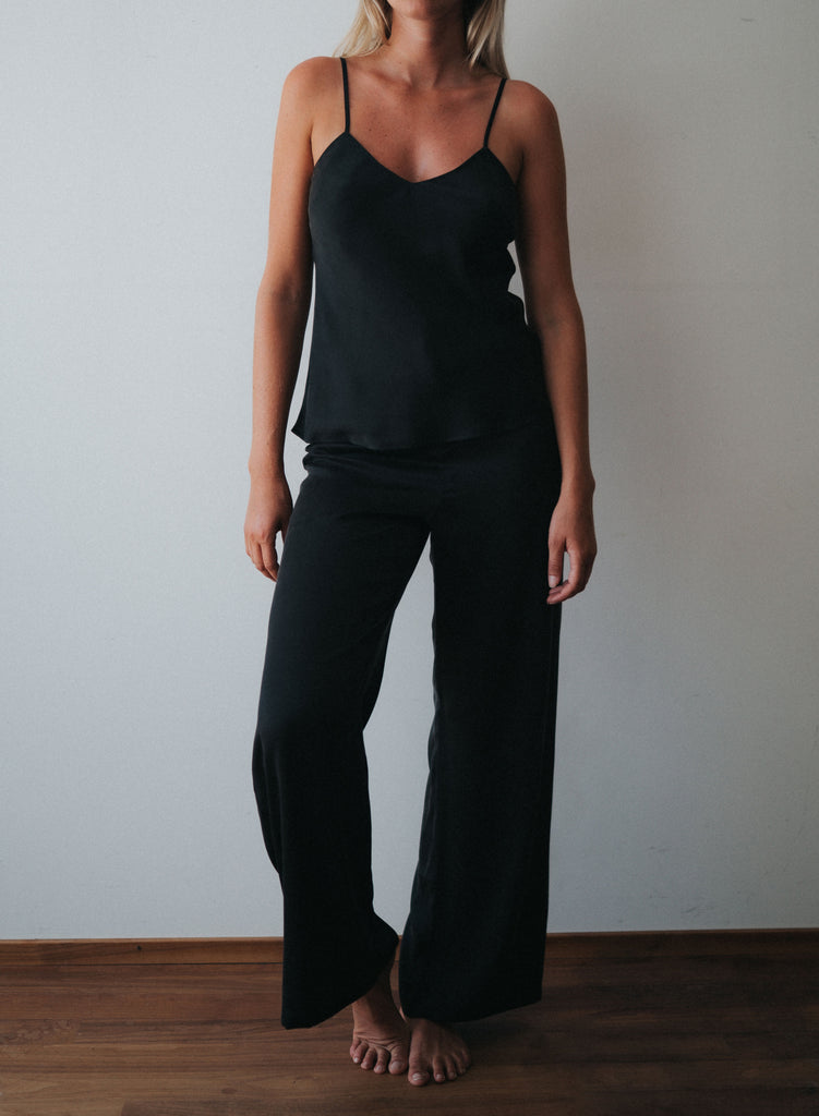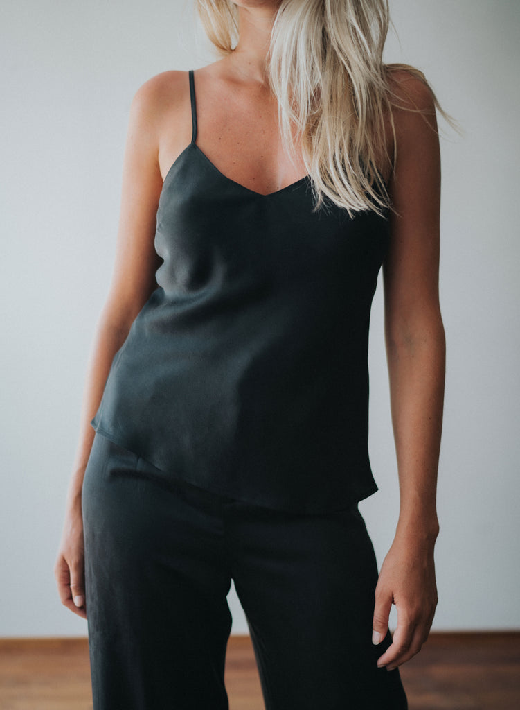 100% Silk. Adjustable straps, lined over the bust for extra coverage & bra friendly.